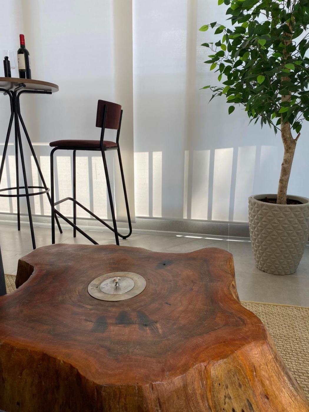 Guests can relax near the outdoor fireplace at the apartment.