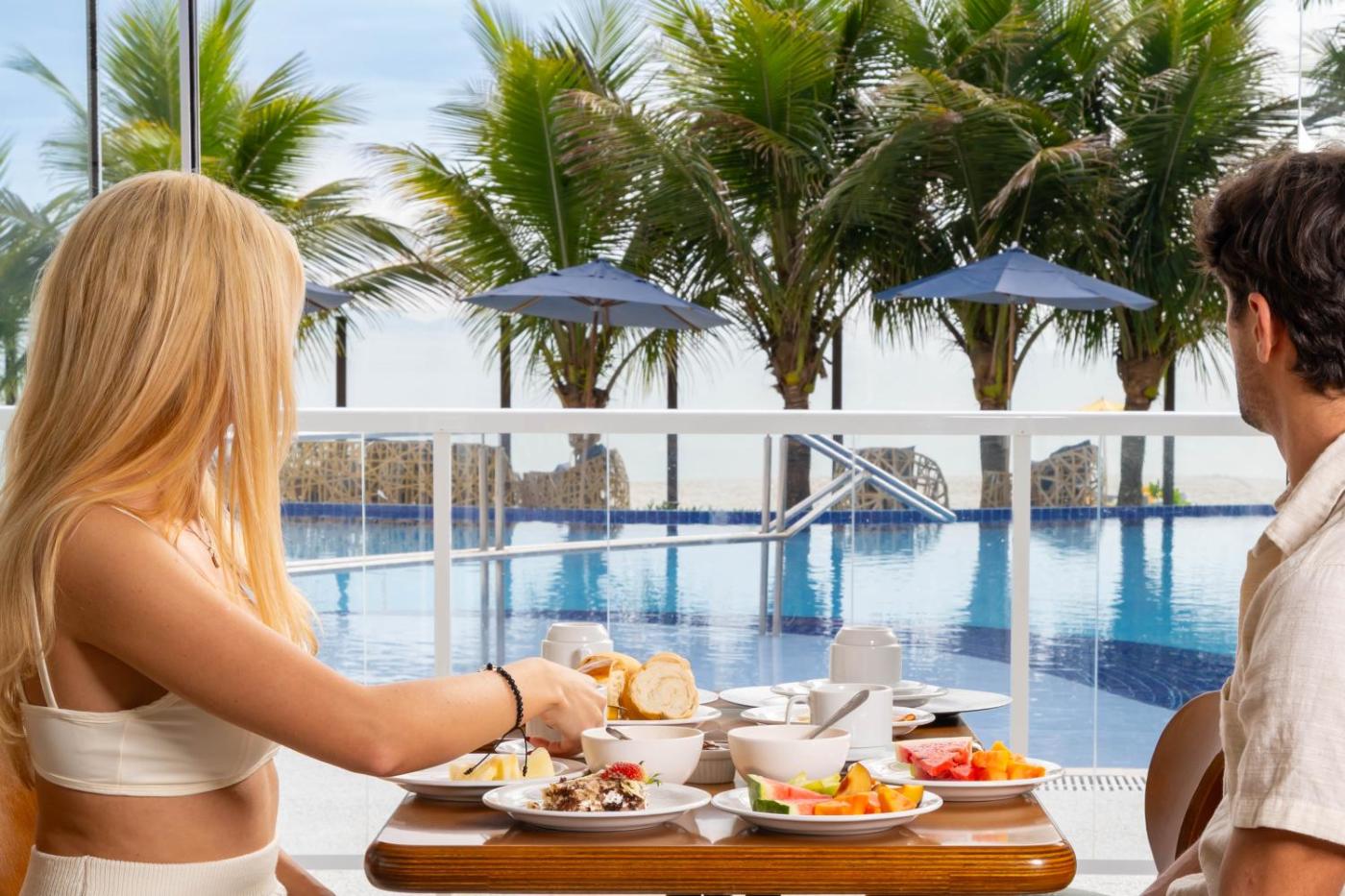 At this hotel, guests can enjoy the outdoor swimming pool as admiring sea views.