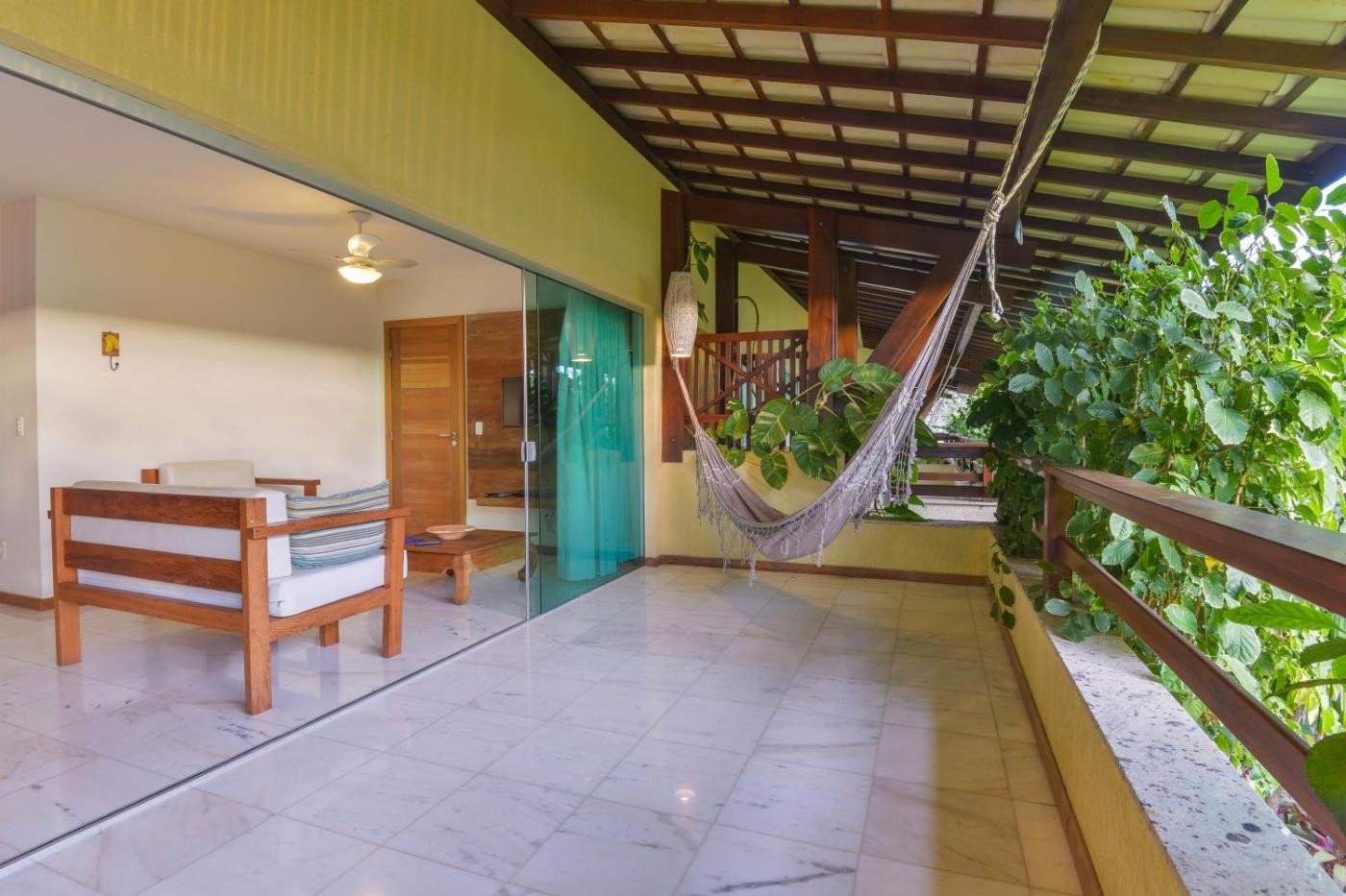 The spacious apartments at Apartamentos Breezes com verde, sossego e preço justo - ideal para famílias e amigos em Imbassaí are decorated with honey-coloured wood and cream furniture. have glass sliding doors allowing a sea breeze and views of the lush gardens.