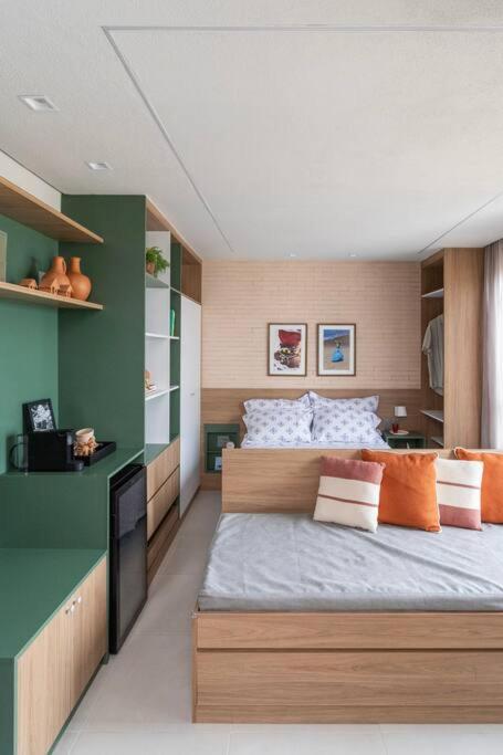 Studio Brasilidade - Novo, charmoso e completo is a beachfront property located in Salvador, 300 metres from Praia do Farol da Barra and less than 1 km from Barras Lighthouse. This property offers a rooftop pool and free private parking. The apartment features a sauna and a lift.