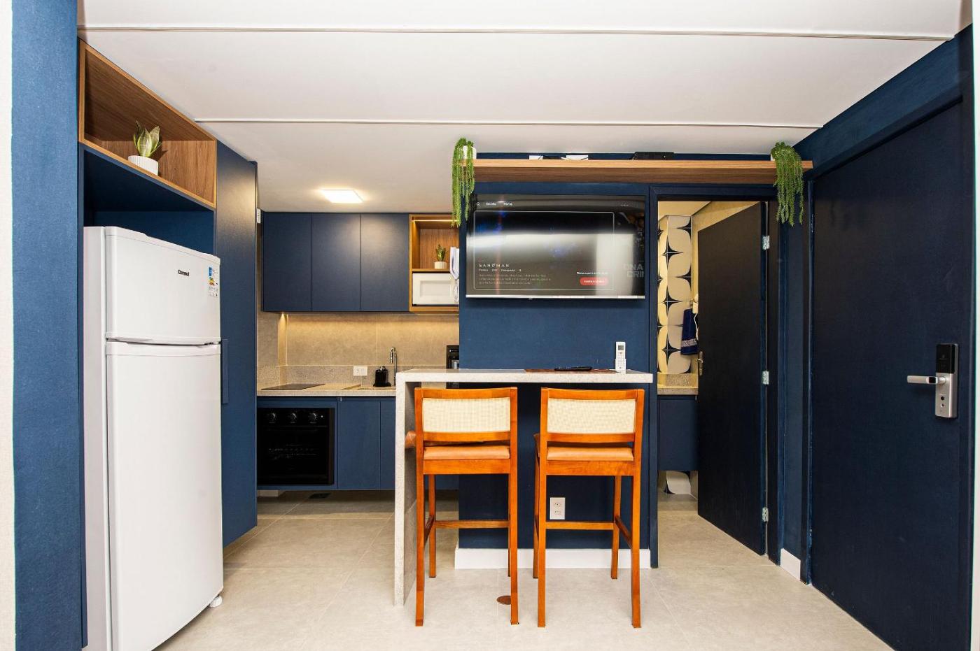 One-Bedroom Apartment. The air-conditioned apartment features 1 bedroom, 1 bathroom with a hairdryer and a kitchen. Guests can make meals in the kitchen that is equipped with a stovetop, a refrigerator, kitchenware and an oven. The apartment provides a coffee machine, a seating area, a wardrobe, a dressing room and a flat-screen TV. The unit offers 2 beds.